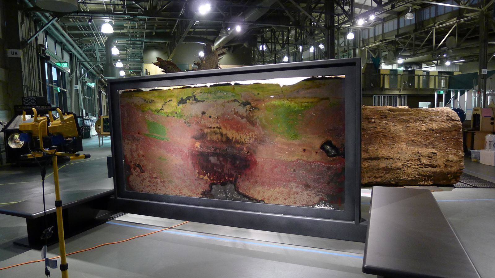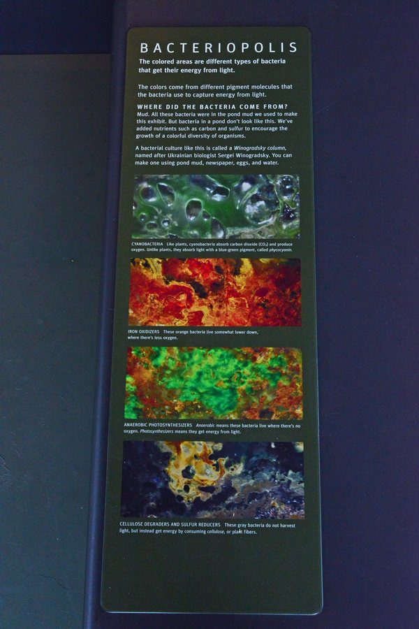 The panels are made by filling thin acrylic tanks with mud from a pond. Some nutrients like iron, cellulose and sulfur are added to the mud and then the panels are illuminated with artificial light; preferably incandescent light like metal halides. The bacteria, which are already present in the mud in low numbers, begin to reproduce. This set up is based on a Winogradsky column. The Ukranian microbiologist Sergei Winogradsky pioneered the study of microbial ecology by growing many different types of bacteria together in the same vessel in the lab.