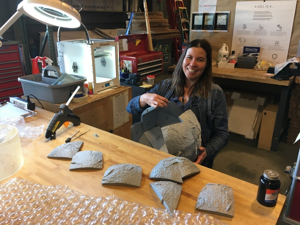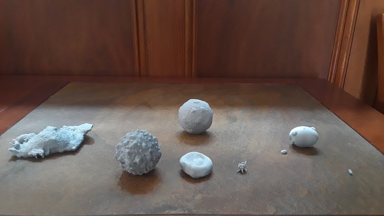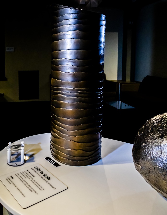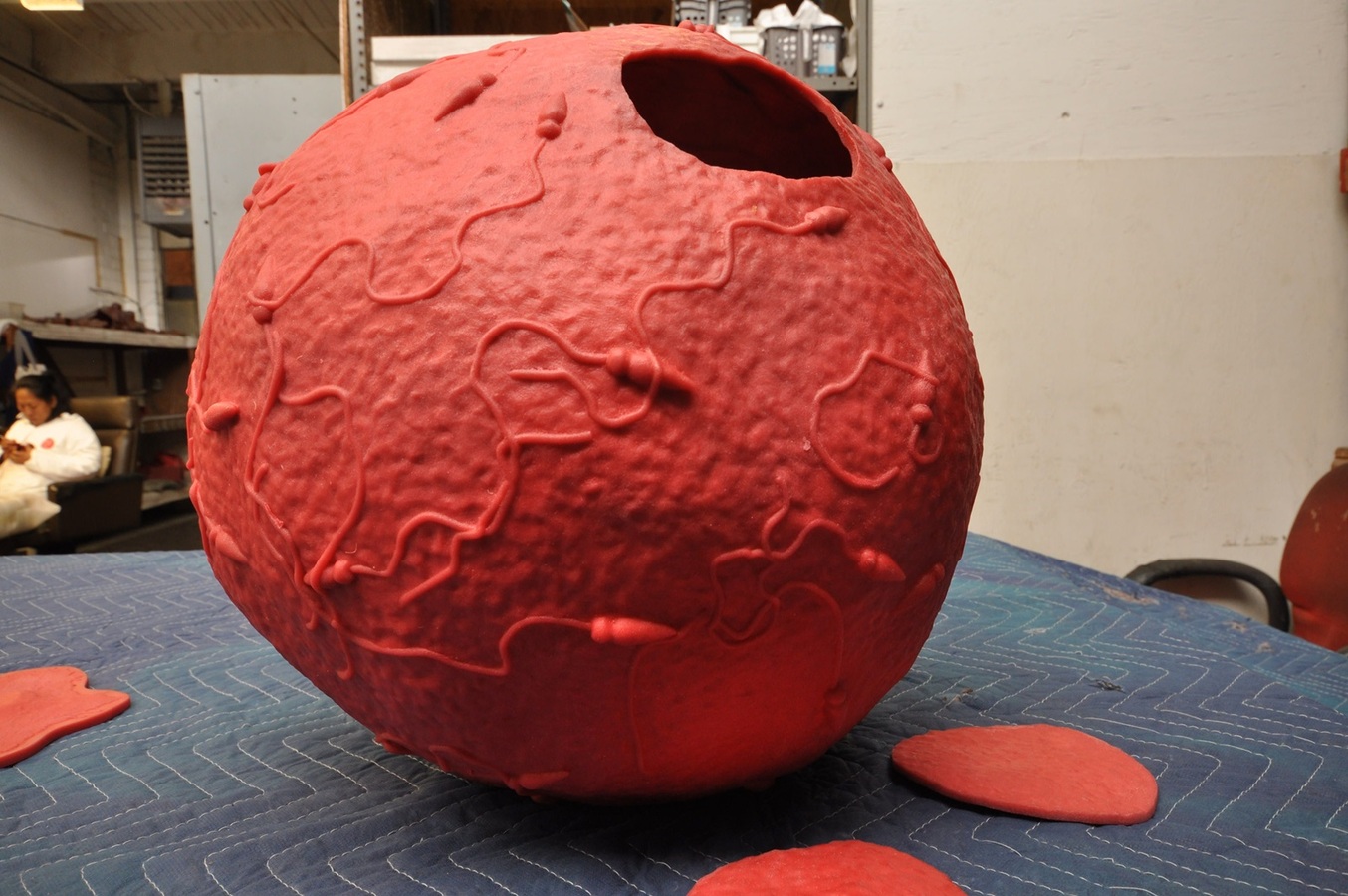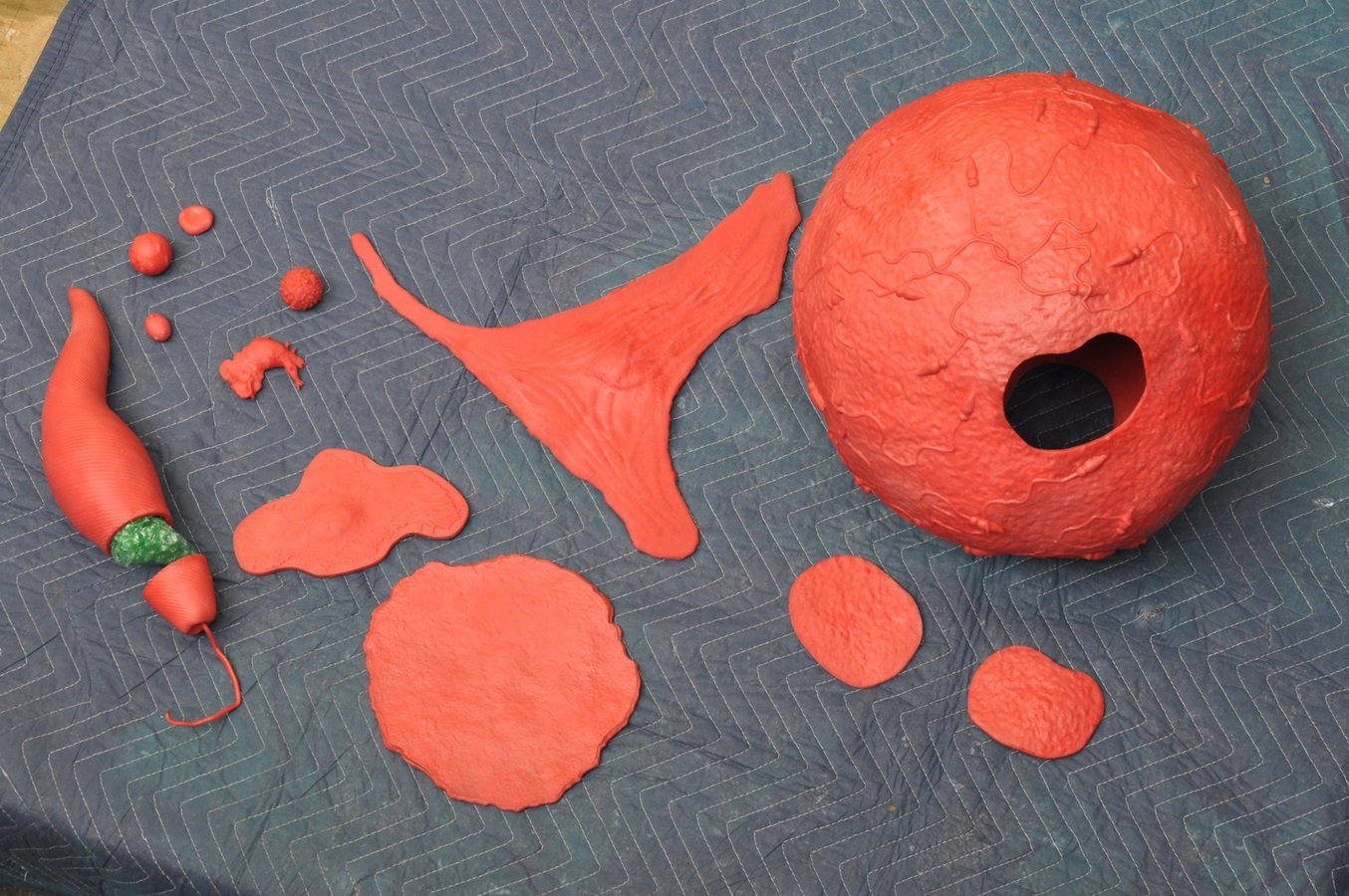 Pictured is our process of creating custom cell bronzes. Each virus particle and cell is modeled from reference images and then 3D printed at 4000 times real size. Wax 3D prints are used for lost wax bronze casting.