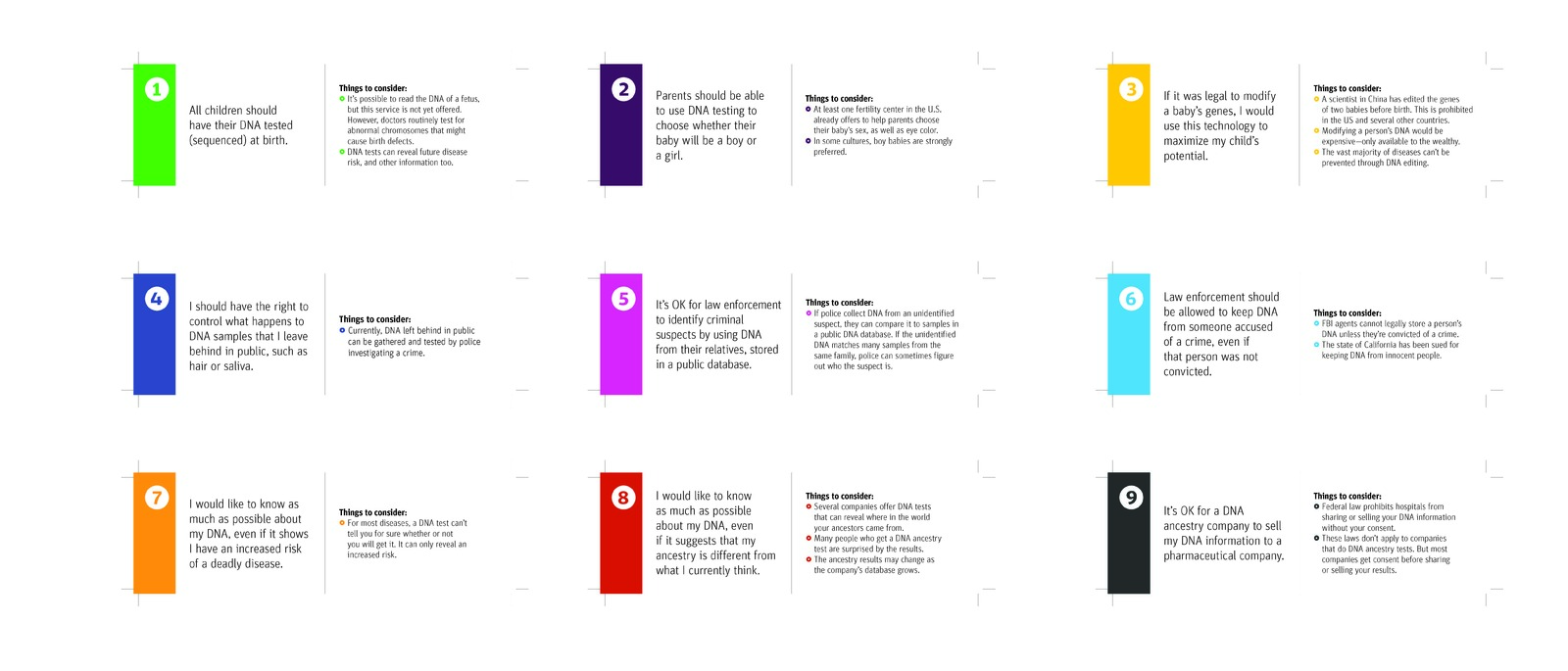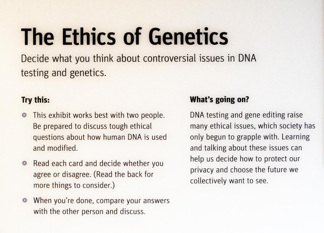 Discuss ethical issues related to the science of genetics in principle and practice. Visitors can explore this exhibit alone or in groups, with 9 cards to guide conversations.